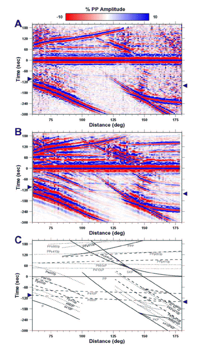 Earth scientists obtain their images of the Earth primarily from seismology. Just as a light bulb illuminates all corners of a room by direct, reflected (bounced) and refracted (bent) light rays, the Earth is “illuminated” by waves that radiate from earthquakes. The image presented here shows all possible direct, reflected and refracted waves from over 7000 earthquakes recorded at over 100 stations scattered around the world. In a sense this is a camera obscura image of the Earth.